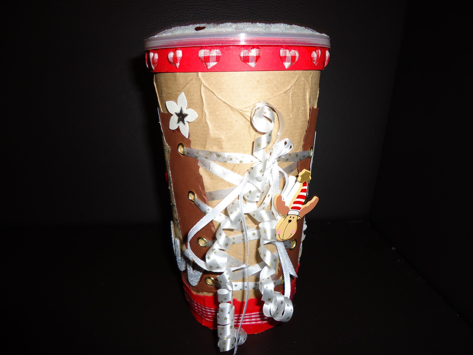 Nun brauchten wir aber eine nette Verpackung für ein kleines Geschenk für eine sehr liebe kleine Dame. Es sollte ruhig schon ein bischen weihnachtlich sein, und außerdem ein bischen "Fassungsvermögen" haben. Da kam es mir wie gerufen, daß meine Kinder so gerne dieses karamelisierte Popcorn essen, das überall in diesen schönen Kunststoff-Bechern angeboten wird. Diese Becher hebe ich nämlich (seit ich im Netz so viele Anleitungen für das "Aufstylen" von Dosen, Schachteln, Bechern etc. gesehen habe) immer auf. Habe mir also Mühe gegeben, den Becher "aufzuhübschen". Das Ergebnis seht Ihr hier: