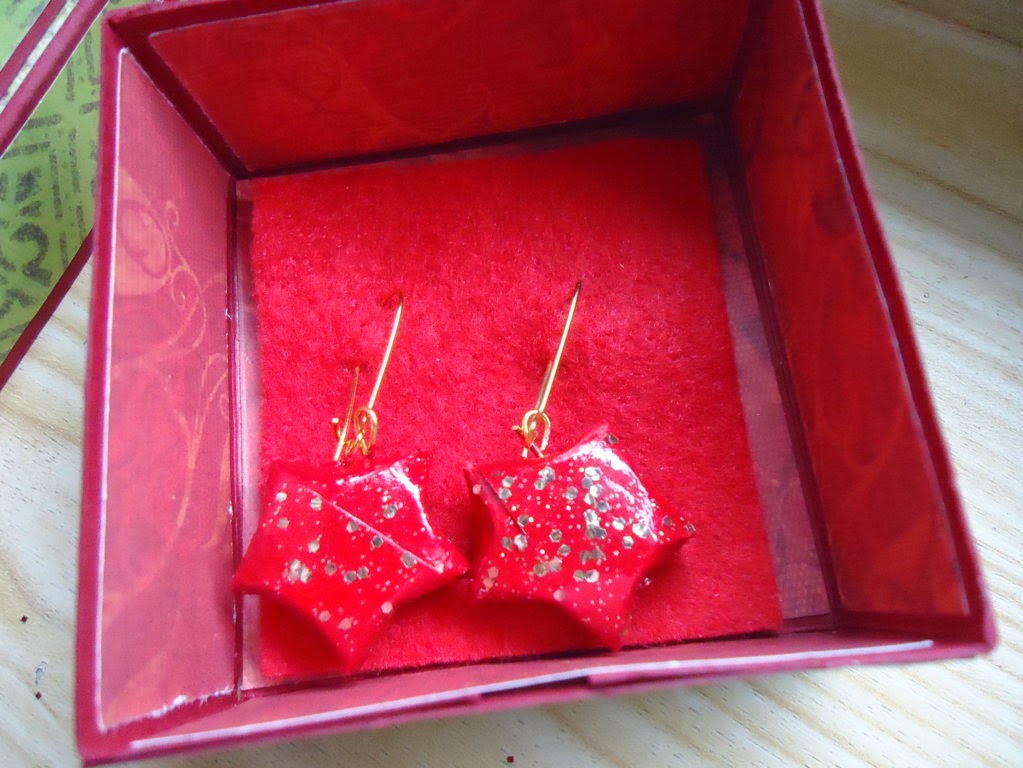 Gefüllt ist die Box mit selbstgemachten Ohrringen. Die Sterne (Origami-Lucky-Stars) werden ja schon haufenweise im Netz gezeigt. Meine Anleitung habe ich auf youtube entdeckt. Sie werden aus einem Papierstreifen gewickelt....